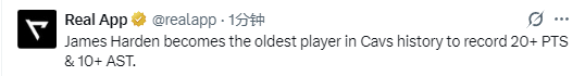 北京时间3月22日,NBA常规赛继续进行,骑士队111-106击败鹈鹕队。哈登此役17投8中得到20分6篮板10助攻1抢断1盖帽,在场正负值+14。根据数据统计显示,他是骑士队史上能单场砍下至少20分10助攻的球员中最老的。