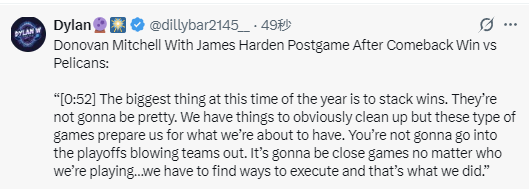 “赛季打到这个阶段,最重要的就是连胜。比赛过程不会打得漂亮,我们显然还有很多地方需要调整改进,但这种硬仗,正好能为我们接下来的征程做好准备。进入季后赛,你不可能每场都碾压对手。无论面对谁,都会是胶着的苦战……我们必须想办法打好关键回合,而今晚我们做到了。”