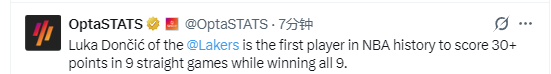 根据数据统计显示,东契奇已经连续9场比赛砍下30+,而且这9场比赛,东契奇全部率队取胜,他也成为了NBA历史上首位做到这点的球员。