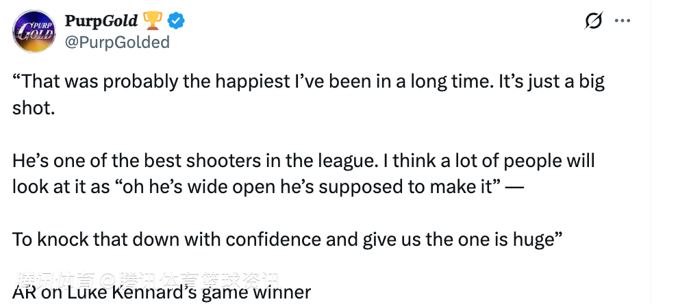 谈到看到肯纳德大空位出手时的想法,里夫斯表示:“我不仅对他,对任何处在这种局面下出手的球员都充满信心。但就像我说的,他是联盟里最顶尖的射手之一。这大概是我很久以来最开心的时刻了。这记投篮太关键了。他是联盟最棒的射手之一。我想很多人会觉得‘哦,他大空位,本该投进的’——但能带着自信投进这球,帮我们拿到胜利,这意义太重大了。”
