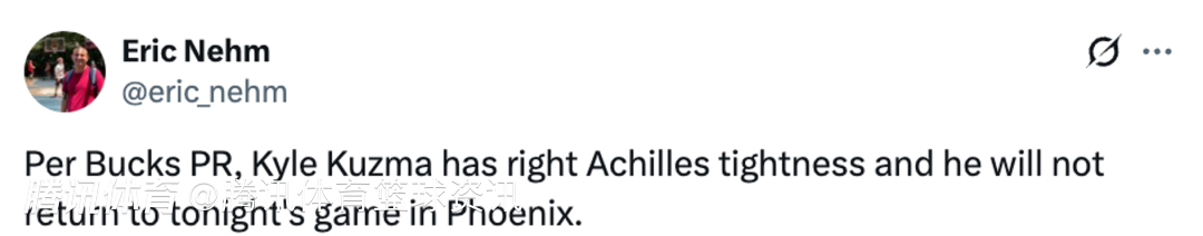 北京时间3月22日,NBA常规赛,雄鹿客场对阵太阳,库兹马在第三节伤退,据雄鹿官方最新消息,库兹马右侧跟腱紧绷,本场比赛不会回归。