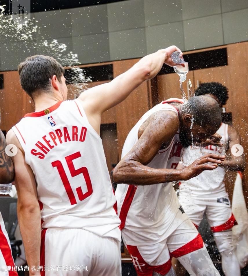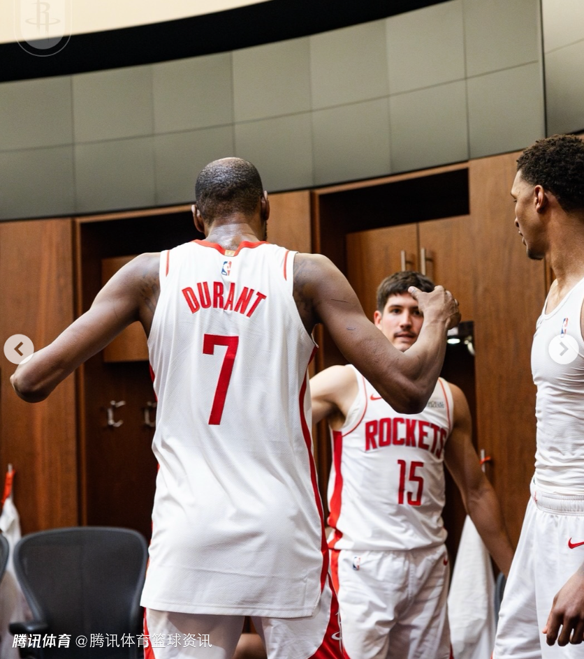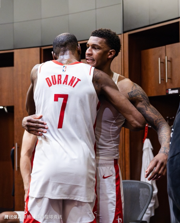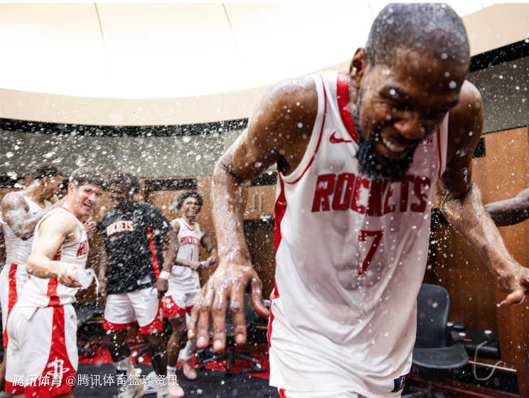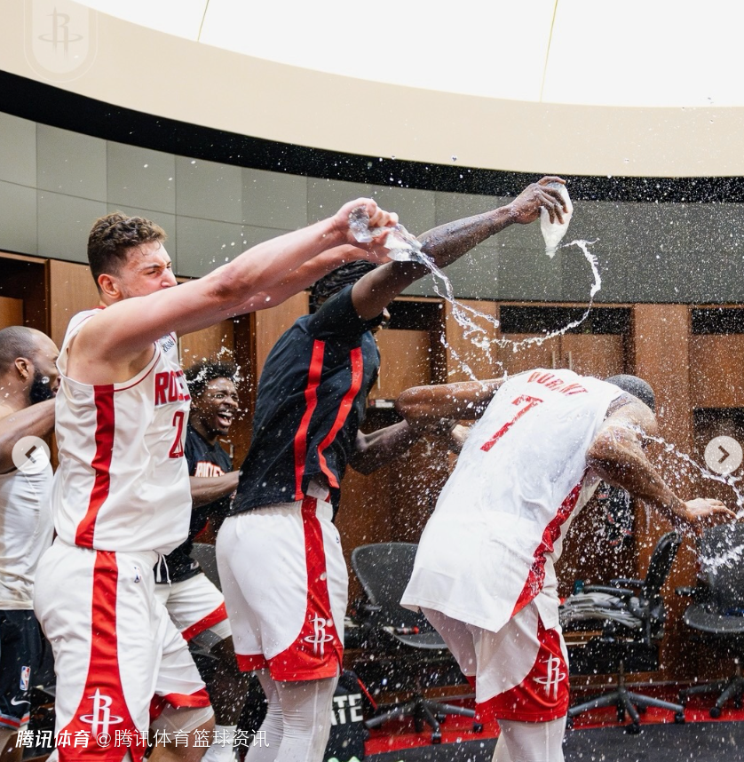 赛后,火箭众将在更衣室向杜兰特泼水庆祝,另外主帅乌度卡也将本场比赛用球给到了杜兰特,后者也和乌度卡相拥致意。