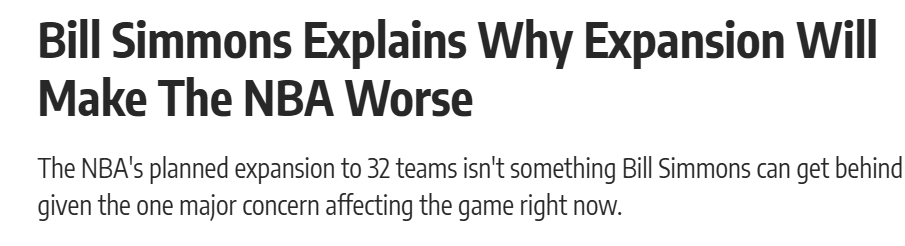 在最新一期节目中,比尔-西蒙斯谈到:现在联盟摆烂风气太重,不适合扩军。他担心,扩军不仅提升不了竞争,只会再多两支球队加入摆烂行列。