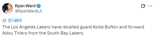 北京时间3月22日,据记者Ryan Ward报道,湖人队已从南湾湖人队召回后卫科比-巴夫金与前锋阿杜-蒂耶罗。