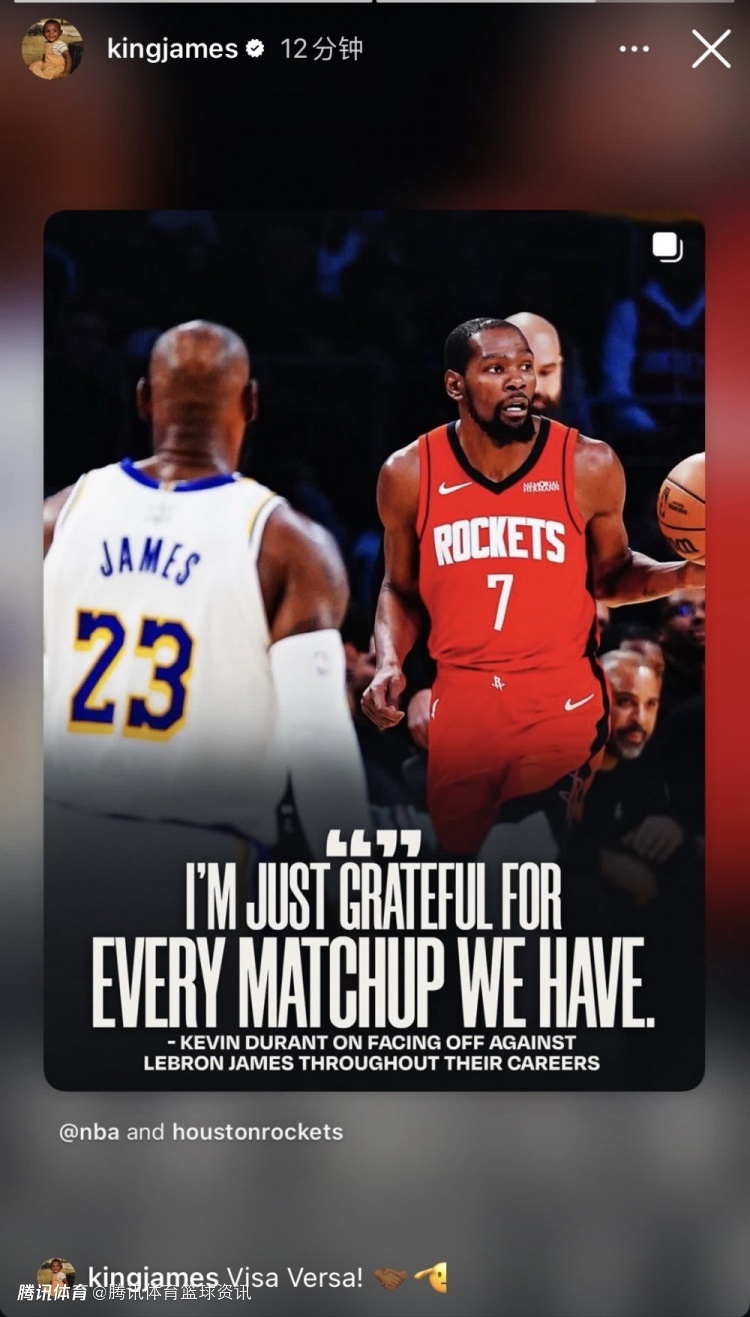 北京时间12月26日,NBA常规赛继续进行,火箭队119-96大胜湖人队。湖人队球员詹姆斯此役得到18分2篮板5助攻2抢断1盖帽。赛后詹姆斯没有接受媒体采访,但他却在个人社交媒体上发布了与杜兰特对决的感受。