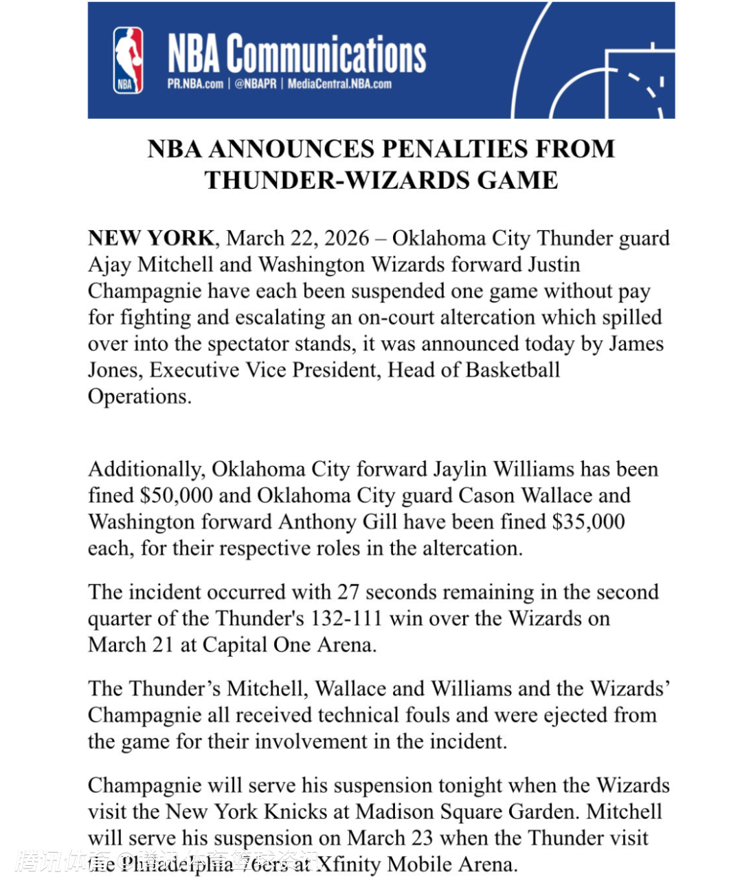北京时间3月23日,NBA官方发布奇才和雷霆比赛冲突的处罚公告,阿贾伊-米切尔和贾斯汀-尚帕涅被禁赛一场,另外杰林威被罚5万,卡森-华莱士和吉尔各被罚5万。
