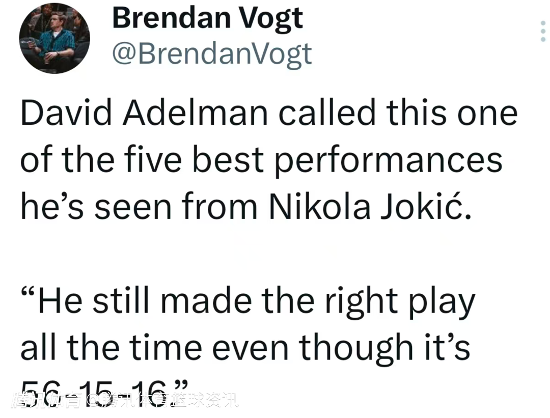 阿德尔曼直言,这是他见过约基奇生涯前五的封神表现:“哪怕轰下56分16篮板15助攻的逆天数据,他全程的每一次出球、每一次选择,依旧全是最优解。”