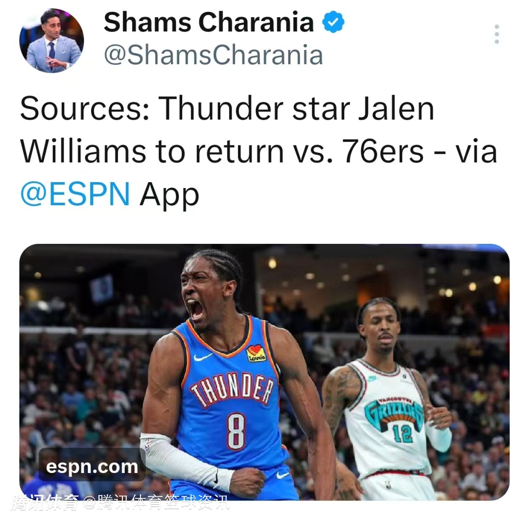 北京时间3月23日,据名记Shams报道,雷霆队明星前锋杰伦-威廉姆斯已从伤病名单中移除,将在周二客场对阵76人的比赛中复出。他因右腿筋拉伤,已缺阵超过五周。