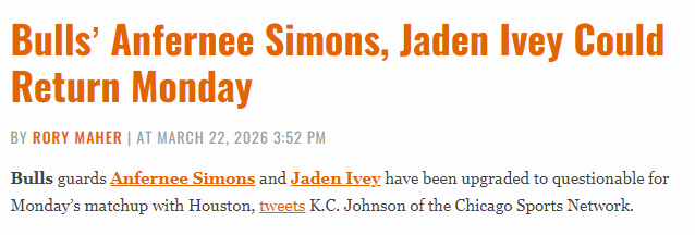 北京时间3月23日,据公牛队记K.C. 约翰逊报道,球队后卫安芬尼-西蒙斯与艾维的出战状态已升级为出战成疑,有望出战周二对阵火箭的比赛。