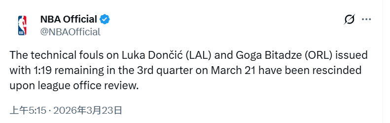 北京时间3月23日,NBA官方宣布,经过复核,3月22日第三节剩余1分19秒时,判给湖人的东契奇与魔术的比塔泽的技术犯规已正式撤销。这也意味着东契奇的第16次技犯已经撤销,他将不会在周二对阵活塞的比赛中被禁赛。