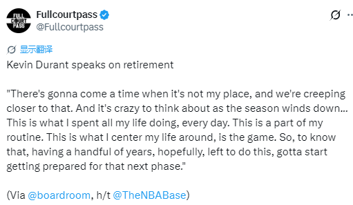 北京时间3月23日,火箭球星杜兰特在接受采访时,谈及退役话题。