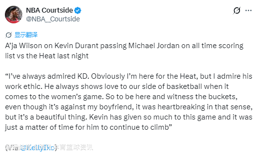 北京时间3月23日,WNBA球星阿贾-威尔逊在接受采访时,谈及昨天杜兰特在对阵热火的比赛中生涯总得分超越迈克尔-乔丹一事。