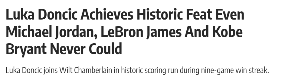 北京时间3月23日,美媒Fadeaway World报道称,东契奇正在打出一段罕见至极的表现。这不只是出色、不只是顶级,而是稀有到——在一段特定区间里,他比肩张伯伦,甚至在这项纪录上超越了乔丹、科比和詹姆斯。
