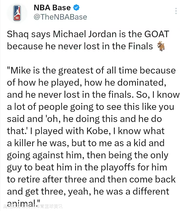 北京时间3月23日,NBA名宿奥尼尔在播客节目上表示,他认为乔丹是历史最佳球员,因为他在总决赛中从没输过。主持人问奥尼尔:“在你看来,场上气场最强、最无解的人,是乔丹、艾弗森还是科比?”