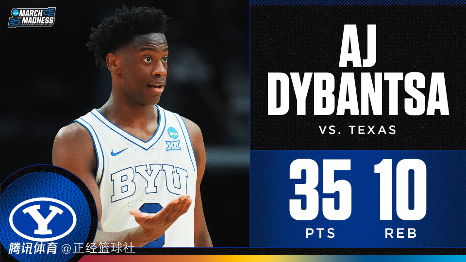 作为本届状元热门的有力竞争者,迪班萨所在的杨百翰大学以赛区6号种子身份出征,却在首轮遭遇滑铁卢。面对11号种子德克萨斯大学,迪班萨打满全场40分钟,交出25投11中、罚球12罚全中,轰下35分10篮板的豪华两双,成为2007年库里之后首位在疯三首秀砍下30+的大一新生。即便他带队在末节掀起追分高潮,缩小分差至个位数,依旧难阻球队71-79落败,止步64强。