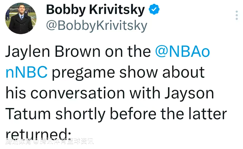 北京时间3月23日,NBA常规赛继续进行,凯尔特人对阵森林狼。凯尔特人球星杰伦-布朗在NBC体育赛前节目中,谈到塔图姆复出前不久两人的对话。