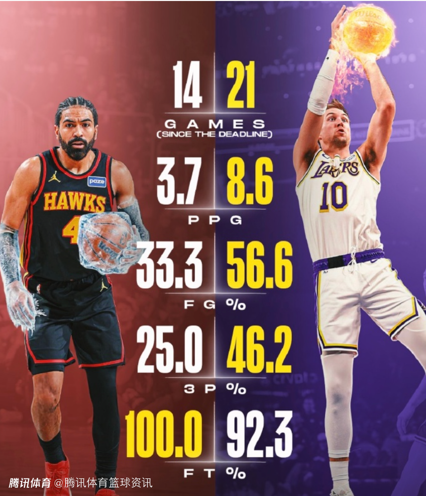 近期,美媒也对比了湖人与老鹰交易的两位主角的表现: