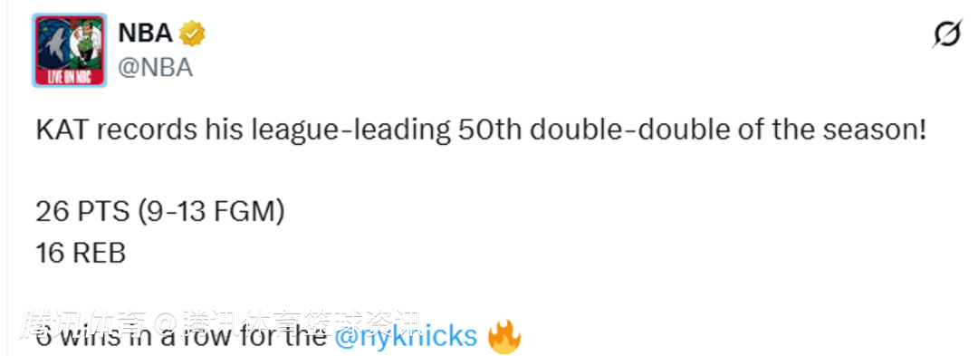 本场比赛,唐斯首发出战25分钟,投篮13中9,拿到26分16篮板3助攻1抢断。这是唐斯本赛季的第50次两双,领跑全联盟。