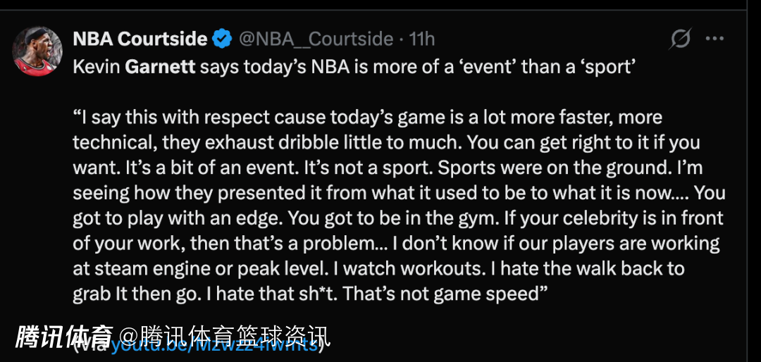 加内特说道:“我说这话是出于尊重,因为现在的比赛节奏快得多、技术含量也更高,球员们的运球次数实在太多了。想进攻的话完全可以直截了当。现在的篮球更像一场秀,而不是一项竞技运动。真正的竞技体育是脚踏实地的。”