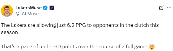 湖媒LakersMuse晒出数据,湖人本赛季关键时刻场均仅让对手得到6.2分,换算后相当于全场让对手拿不到60分。