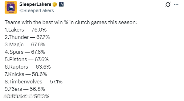 据美媒统计,本赛季球队关键时刻的胜率为——湖人76%联盟第一,雷霆67.7%联盟第二,魔术、马刺和活塞并列为67.6%,猛龙63.6%,尼克斯58.6%,森林狼57.1%,76人56.8%和雄鹿56.3%。