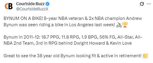 北京时间3月23日,有媒体拍到前NBA球员安德鲁-拜纳姆在洛杉矶骑自行车的视频,他曾在NBA征战8年,两次获得NBA总冠军。