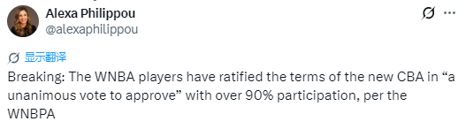 球员工会在声明中表示,超过90%的球员参与了此次投票,结果为全票通过。该劳资协议将交由WNBA联盟官方批准。