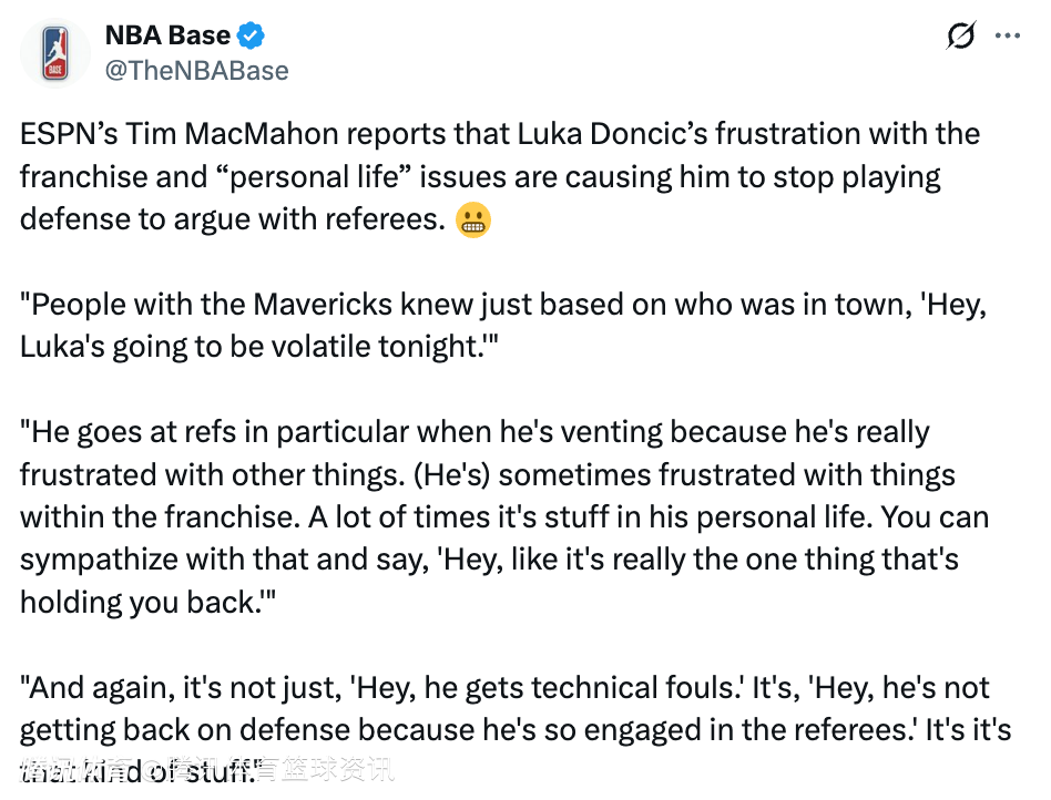 北京时间3月23日,据ESPN名记麦克马洪报道,东契奇因对球队的不满以及“个人生活”问题,导致他无心防守,转而与裁判争执。