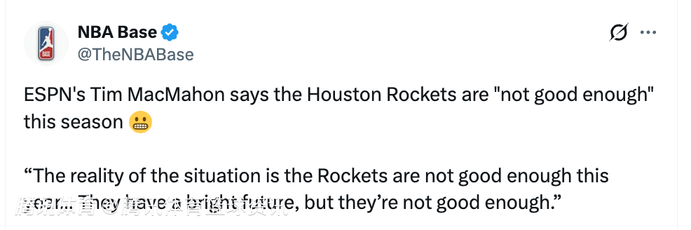 麦克马洪表示,火箭本赛季实力还不够:“现实情况是,火箭今年的实力还不够,他们拥有光明的未来,但就目前而言,他们还不够强。”