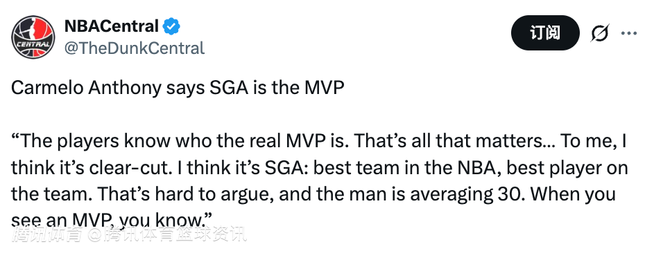 “因为我们真的在场上对位过、对抗过,我们知道要面对什么,知道要怎么去竞争。那些媒体看不到、也理解不了的细节,我们都懂。他们只看数据、看高阶统计、看故事、看舆论风向。在我看来,这其实非常明显。我觉得就是亚历山大。联盟战绩第一的球队,队内最好的球员,这一点很难反驳,而且他场均能拿下30+得分,你一看就知道,谁是MVP,一眼就能看出来。”
