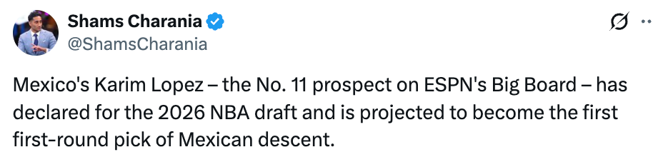 北京时间3月24日,据名记Shams报道,墨西哥球员卡里姆-洛佩兹(在ESPN选秀榜上排名第11)已宣布参加今年NBA选秀,预计将成为首位在首轮被选中的墨西哥裔球员。