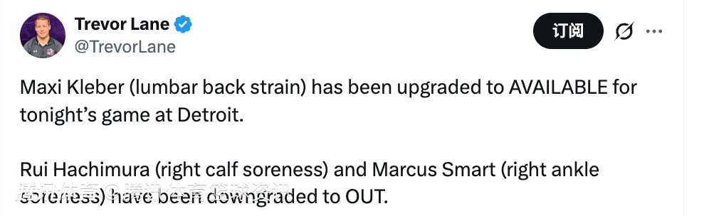 北京时间3月24日,今天早上7点,湖人将客场对阵活塞,赛前湖人更新了本场比赛的伤病报告,其中斯马特(右脚踝酸痛)和八村垒(右小腿酸痛)将缺席,克勒贝尔(背部拉伤)可以出战。
