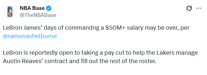 北京时间3月24日,ESPN名记谢尔本报道,詹姆斯拿5000万美元以上年薪的日子可能已经结束了。报道称,詹姆斯愿意接受降薪,以帮助湖人处理里夫斯的续约合同,并为球队填充阵容腾出薪资空间。