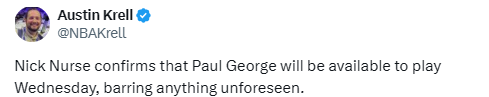 纳斯表示,若无意外,乔治将在本周四迎来复出。乔治此前因违反联盟禁药政策被禁赛25场,目前仅剩最后1场,解禁在即。