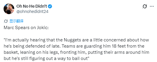 斯皮尔斯说道:“我确实听说,掘金队最近有点担心他被防守的方式。对手会在距离篮筐18英尺的位置就开始防守他,顶他的腿、绕前防守、用手臂缠他,但即便如此,他依然能找到办法打出统治级表现。”