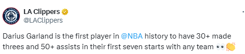 据统计,加兰成为NBA历史首位在为任意球队首发的前7场比赛中,命中至少30记三分(31记)且送出50+助攻(53次)的球员。