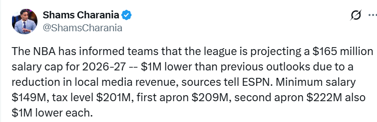 北京时间3月24日,据名记Shams报道,ESPN消息源透露:NBA已告知各支球队,联盟预测2026-27 赛季工资帽为1.65亿美元。由于地方媒体收入下滑,相比此前预测下调100万美元。其他指标同样下调100万美元,具体如下:穷人线1.49亿美元,奢侈税起征线2.01亿美元,第一土豪线2.09亿美元,第二土豪线2.22亿美元。详情稍后。