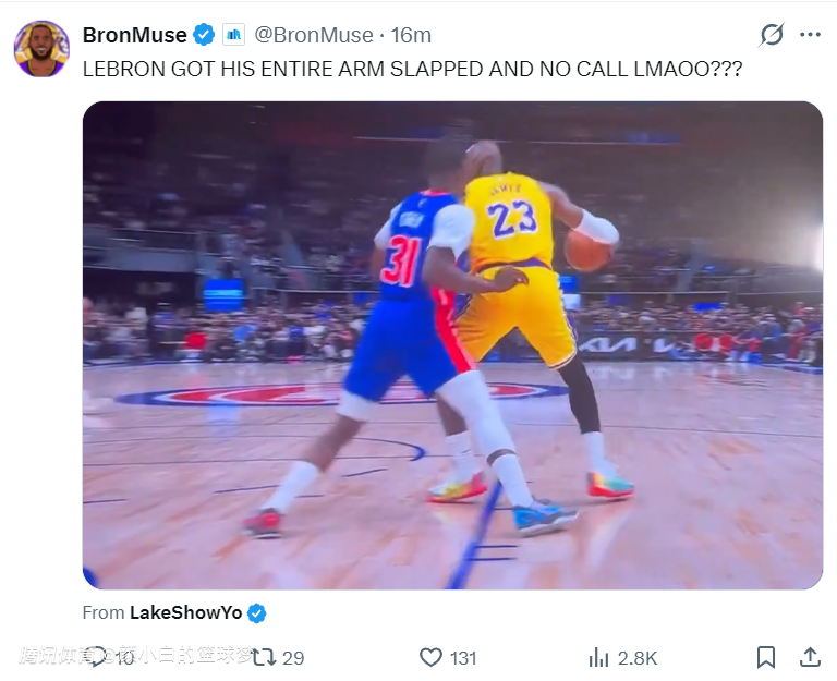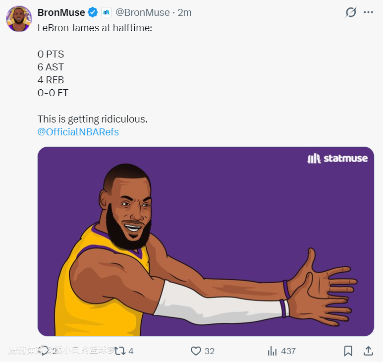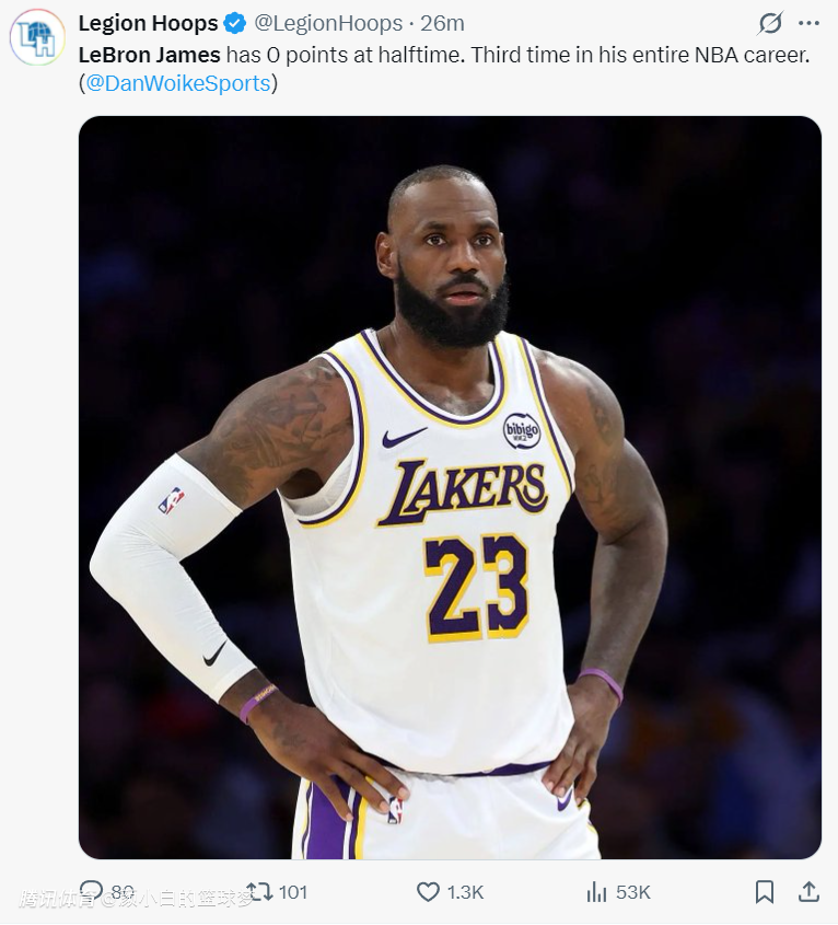 整个上半场詹姆斯出战了18分钟,5中0,三分1中0,拿到0分4篮板6助攻,多次冲击篮下都没有获得罚球,湖人媒体:@NBA官方裁判写道这简直太荒谬了。