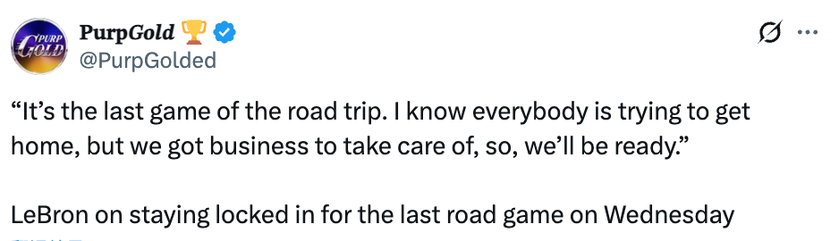 谈及周四对阵步行者的比赛该如何保持专注,詹姆斯表示:“这是我们这次客场之旅的最后一场。我知道大家都想回家,但我们还有任务要完成,所以我们会做好准备。”