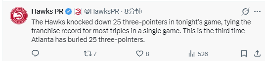 此外,库明加本场比赛投中4记三分球,追平个人职业生涯单场三分球命中数纪录。老鹰全队命中25记三分球,追平队史单场三分命中数纪录。这是老鹰队历史上第三次单场投进25记三分。老鹰队此役送出30次助攻,本赛季总助攻数达到2181次,超越2023-24赛季,升至队史单赛季总助攻数第二位。