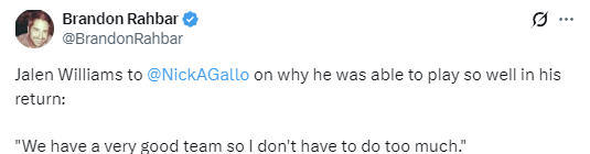 在谈到复出首战为何就能状态火热时,杰伦-威廉姆斯表示:“我们球队实力很强,所以我不需要做太多事。这支球队非常优秀,背后离不开大量的体能储备训练,并且一直维持着状态。”