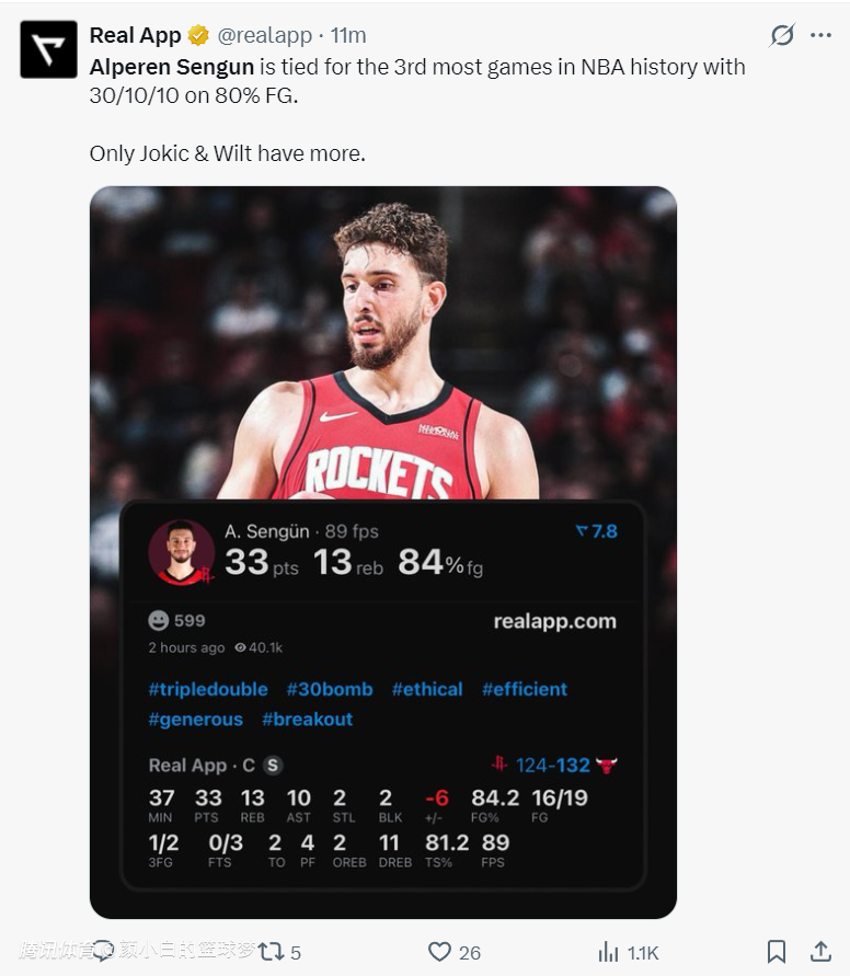 5.申京成为历史第三个以80%命中率拿到30+10+10的球员,比肩张伯伦、约基奇;