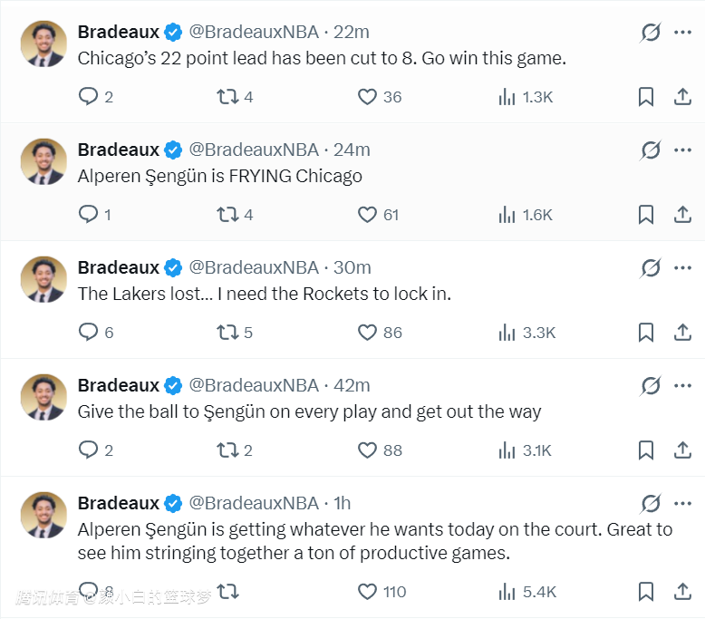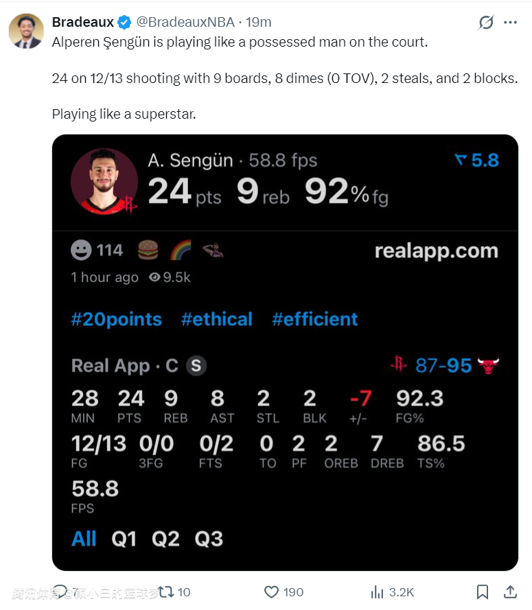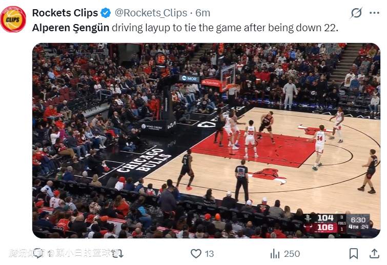 第三节申京更是单节6中6拿到12分6助攻5篮板,休媒:申京此役在球场上所向披靡,他想要什么就有什么。看到他接连打出多场高效的比赛真是太好了。火箭队在一度落后22分的情况下他一人扛着球队,申京正在烹饪公牛!