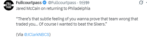 麦凯恩表示:“你心里总会隐隐憋着一股劲,想要证明交易掉你的那支球队看错了你。但说到底,我只想赢球。当然,我就是想击败76人队,想用正确的方式打篮球。每当你踏上球场,这就是一种本能,上场后无私打球、做自己、满怀信心地去比赛。”