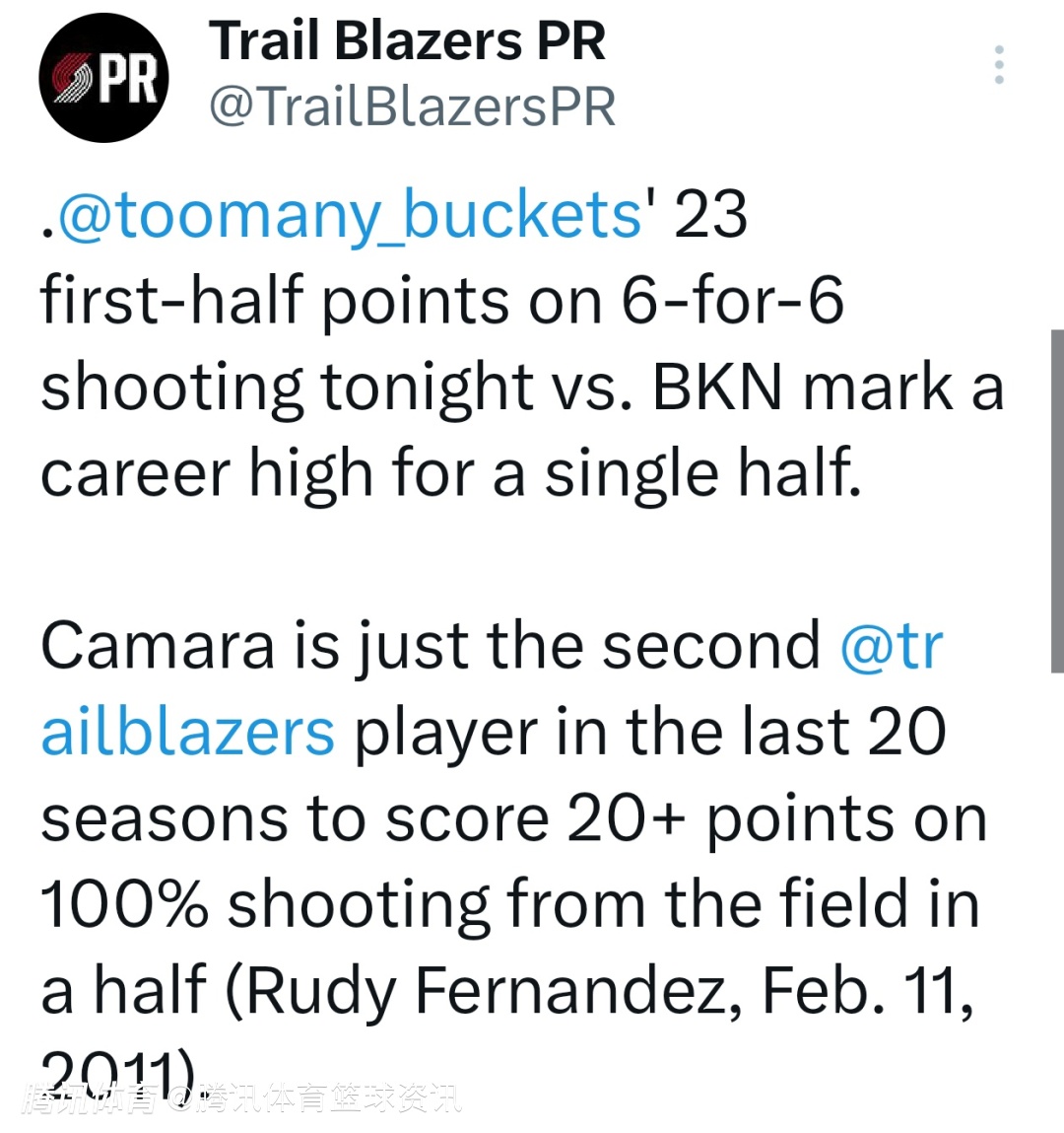 本场对阵篮网,卡马拉半场6投6中,狂砍23分,创下个人生涯半场得分新高。卡马拉也成为开拓者过去20个赛季里,第二位半场命中率100%且砍下20+得分的球员,上一位是2011年2月12日的鲁迪-费尔南德斯。