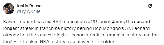 目前莱昂纳德已经连续48场比赛砍下20+,排在队史第二位,仅次于麦卡杜的连续57场20+。但需要注意的是,麦卡杜是跨赛季做到这点,而莱昂纳德单赛季连续48场20+,则是快船队史纪录。同时,莱昂纳德也保持着NBA历史上30岁及以上球员的最长连续20+纪录。