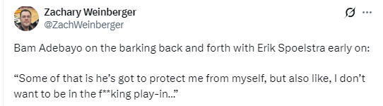 阿德巴约也谈到了与斯波的争执,他表示:“一方面,他是怕我心态失衡、在保护我;但另一方面,我真的不想去打该死的附加赛。”