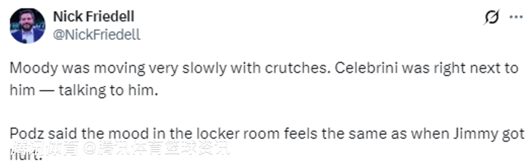 据美记Brett Siegel报道,穆迪被担架抬离球场,在他接受医疗处理时,双方球员都眼含泪水,全场一片沉寂。另外据美记Nick Friedell透露,穆迪拄着拐杖,行动非常缓慢。切莱布里尼(勇士医疗队主管)就走在他身旁,和他交谈着,波杰姆斯基也表示,更衣室里的氛围和此前巴特勒受伤时一模一样。