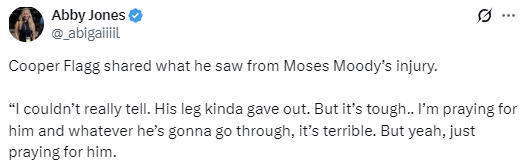 北京时间3月24日,NBA常规赛继续进行,独行侠队经过加时苦战,131-137不敌勇士队。本场比赛最后时刻,勇士队球员穆迪遭遇重伤。赛后,独行侠球员库珀-弗拉格(此役砍下32分)接受采访,谈到了自己对于穆迪受伤一事的看法。
