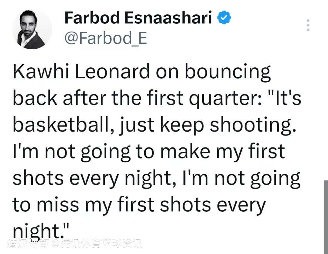 莱昂纳德首节只有7中1的表现。谈及首节后如何调整状态,莱昂纳德表示:“篮球就是这样,继续投就好。我不可能每晚开局都投进,也不可能每晚开局都投不进。”